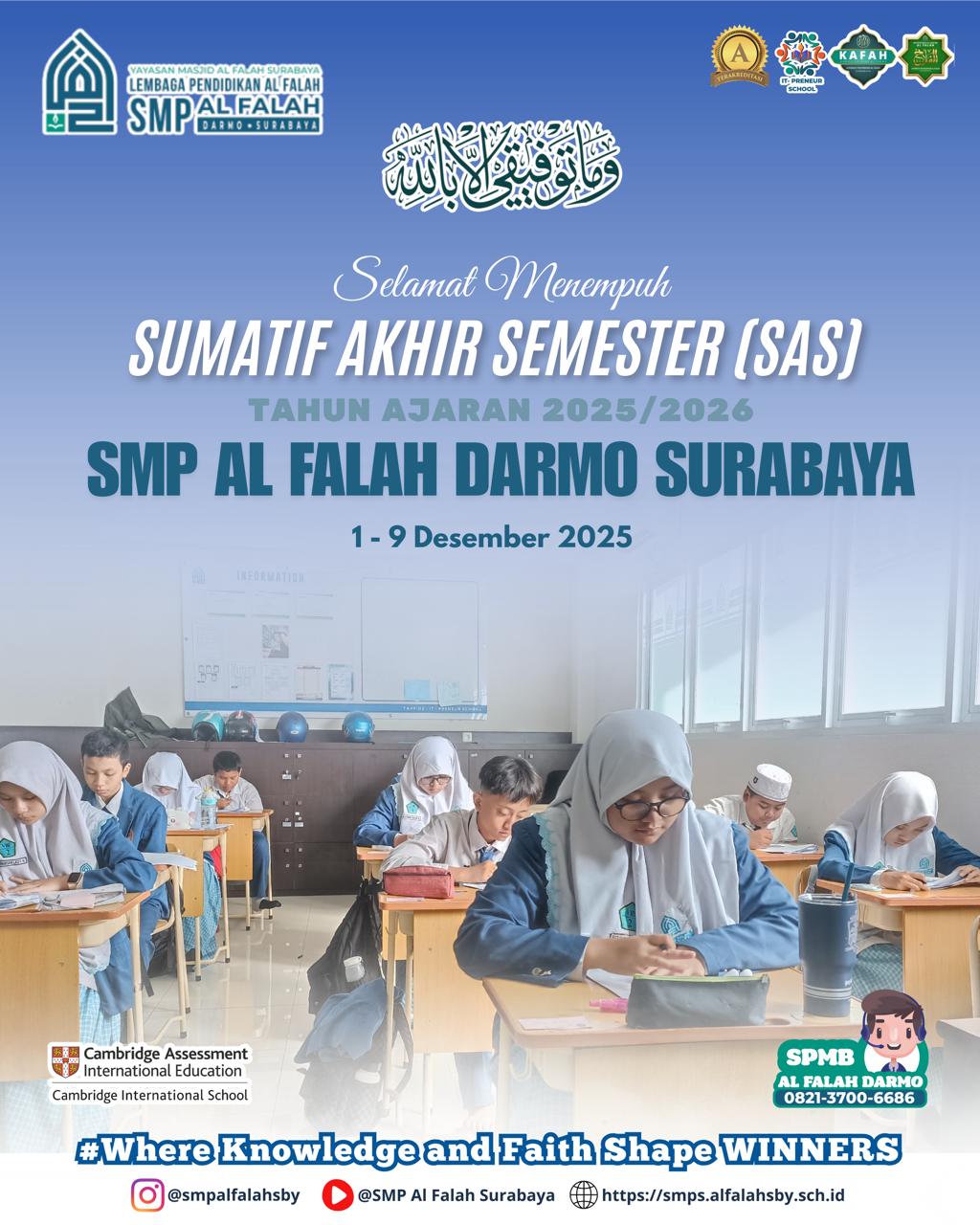 [SUMATIF AKHIR SEMESTER 1] Setelah menjalani proses belajar mengajar selama satu semester, kini saatnya seluruh siswa-siswi SMP Al Falah Surabaya membuktikan hasil belajar mereka melalui Sumatif Akhir Semester (SAS) 1 mulai tanggal 1–9 Desember 2025. Selamat menempuh Sumatif ...